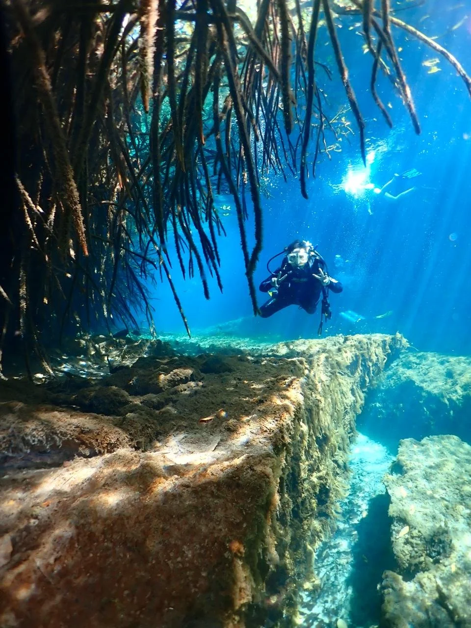 One of the highlights of the dive is swimming back toward the entrance, where fallen trees and bright light create a stunning view. The dive finishes with a safety stop in the garden, surrounded by the cenote’s lively creatures.